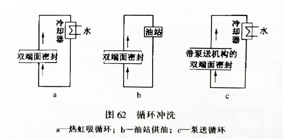 循環(huán)沖洗是經過一個泵送裝置使外加的密封流體進行循環(huán)(圖62)。這里有兩點需要引起留意,一是“泵送裝置”,可以是外加的油站和密封腔形成閉合回路進行循環(huán),也可在密封腔中裝設一個泵,或者是用熱虹吸的原理使流體循環(huán)。另一點要留意的是“外加的密封流體”。這種沖洗方法用在雙端面或多端面密封上,在單端面密封上不選用。循環(huán)沖洗也有人稱為“外循環(huán)”。