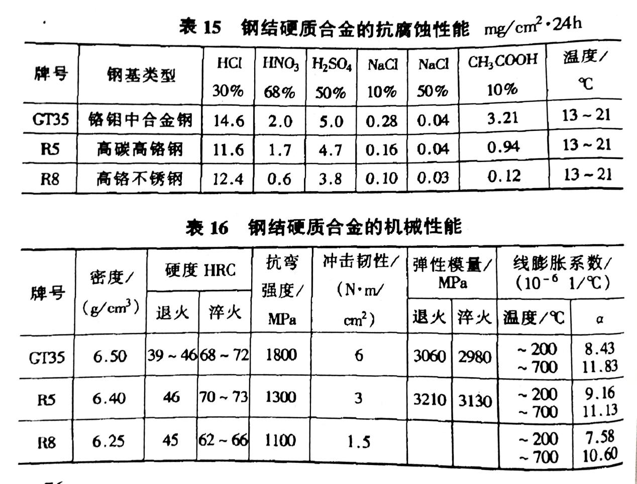 鋼結(jié)硬質(zhì)合金的耐腐蝕性能隨鋼基的類型不同而異。它們在海水和堿液中的耐蝕性較好,在其他介質(zhì)中的耐蝕情況和機(jī)械性能見表 15、16。