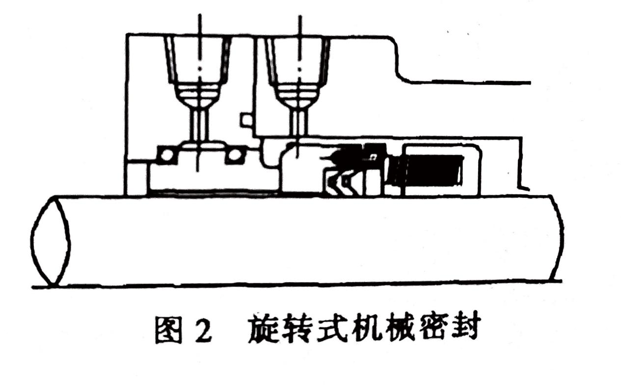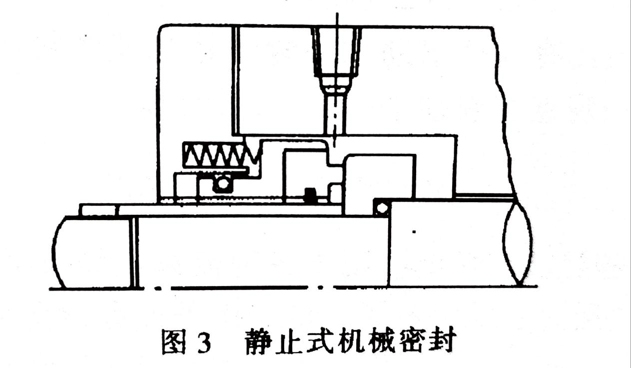 按補償結(jié)構(gòu)彈性元件的運動情況,可以分為旋轉(zhuǎn)式和靜止式機械密封。補償結(jié)構(gòu)隨軸旋轉(zhuǎn)的稱為旋轉(zhuǎn)式機械密封(圖2);補償結(jié)構(gòu)不旋轉(zhuǎn)的(安裝在壓蓋內(nèi))稱為靜止式機械密封(圖3)。補償結(jié)構(gòu)旋轉(zhuǎn)時易發(fā)生質(zhì)量不平衡,同時消耗攪拌功率,因此,旋轉(zhuǎn)式密封不能用于高速;而靜止式密封可用于高速。可是旋轉(zhuǎn)式密封安裝較方便,所以,普通的機械密封大多選用旋轉(zhuǎn)式結(jié)構(gòu)。