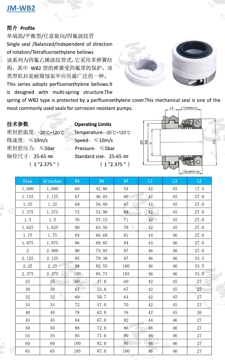 該系列為四氟乙烯波紋管式,它采用多彈簧結(jié)構(gòu),其中 WB2型的彈簧受四氟罩的保護(hù)。該類型機(jī)封是耐腐蝕泵中應(yīng)用最廣泛的一種。