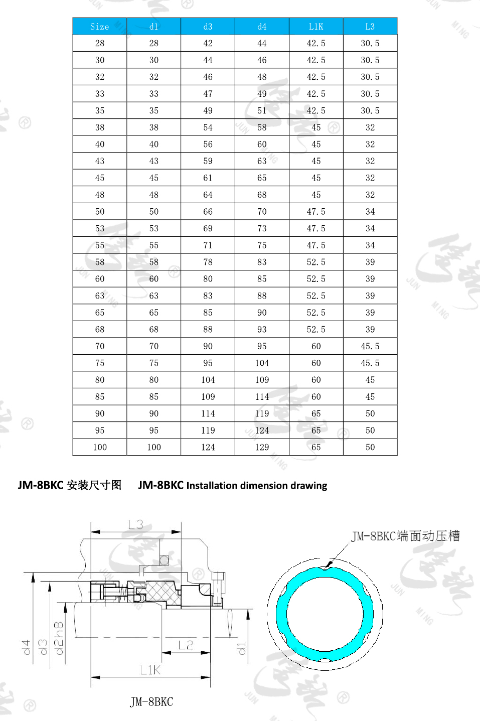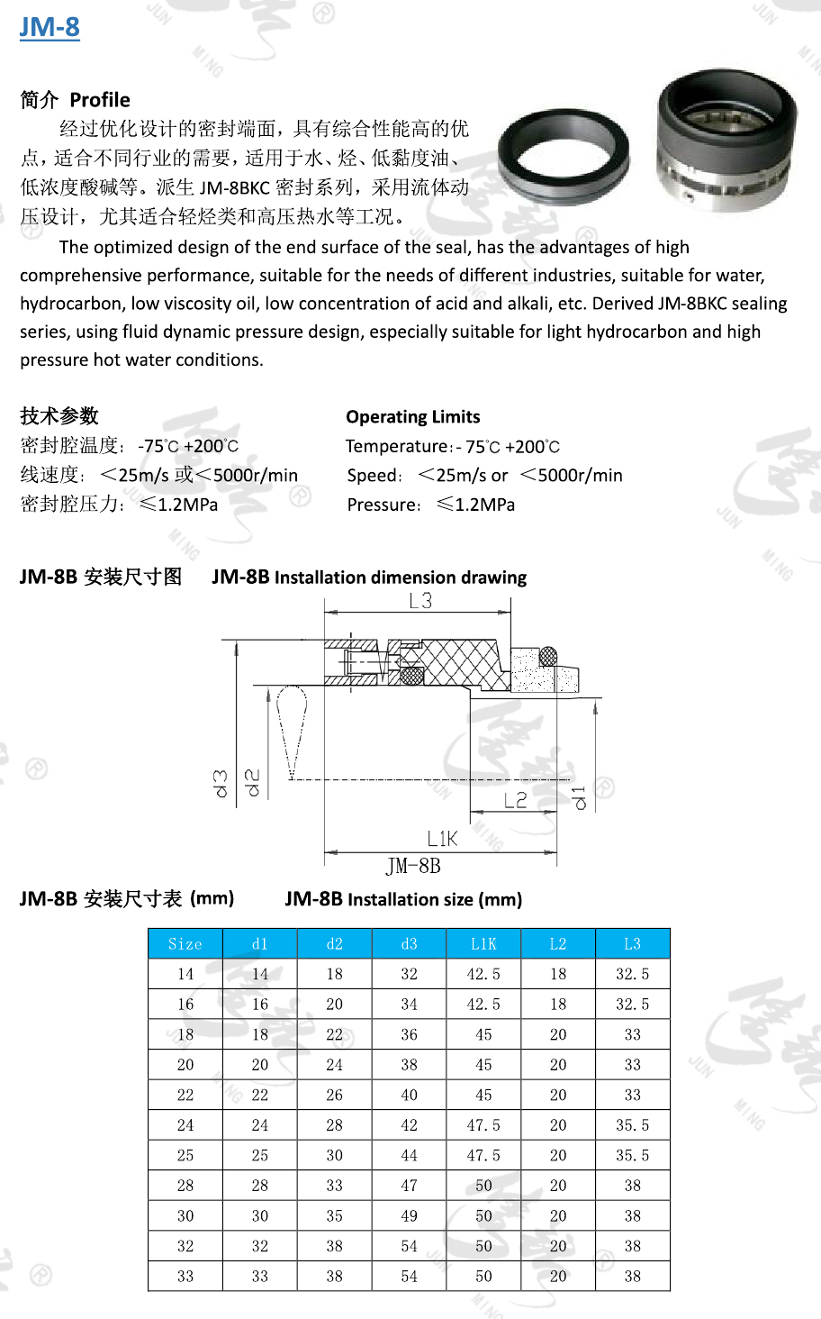 經(jīng)過(guò)優(yōu)化設(shè)計(jì)的密封端面,具有綜合性能高的優(yōu)點(diǎn),適合不同行業(yè)的需要,適用于水、烴、低黏度油、低濃度酸堿等。派生JM-8BKC密封系列,采用流體動(dòng)壓設(shè)計(jì),尤其適合輕烴類和高壓熱水等工況。