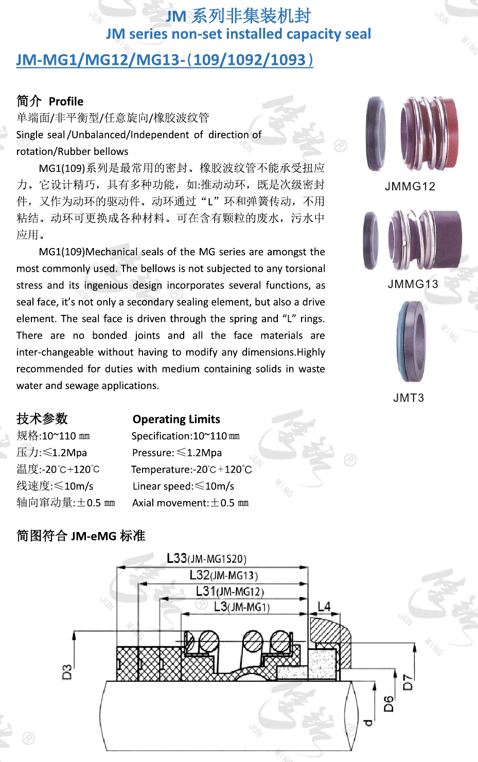MG1(109)系列是最常用的密封。橡膠波紋管不能承受扭應(yīng)力。它設(shè)計(jì)精巧,具有多種功能,如:推動(dòng)動(dòng)環(huán),既是次級(jí)密封件,又作為動(dòng)環(huán)的驅(qū)動(dòng)件。動(dòng)環(huán)通過(guò)“L”環(huán)和彈簧傳動(dòng),不用粘結(jié)。動(dòng)環(huán)可更換成各種材料。可在含有顆粒的廢水,污水中應(yīng)用。