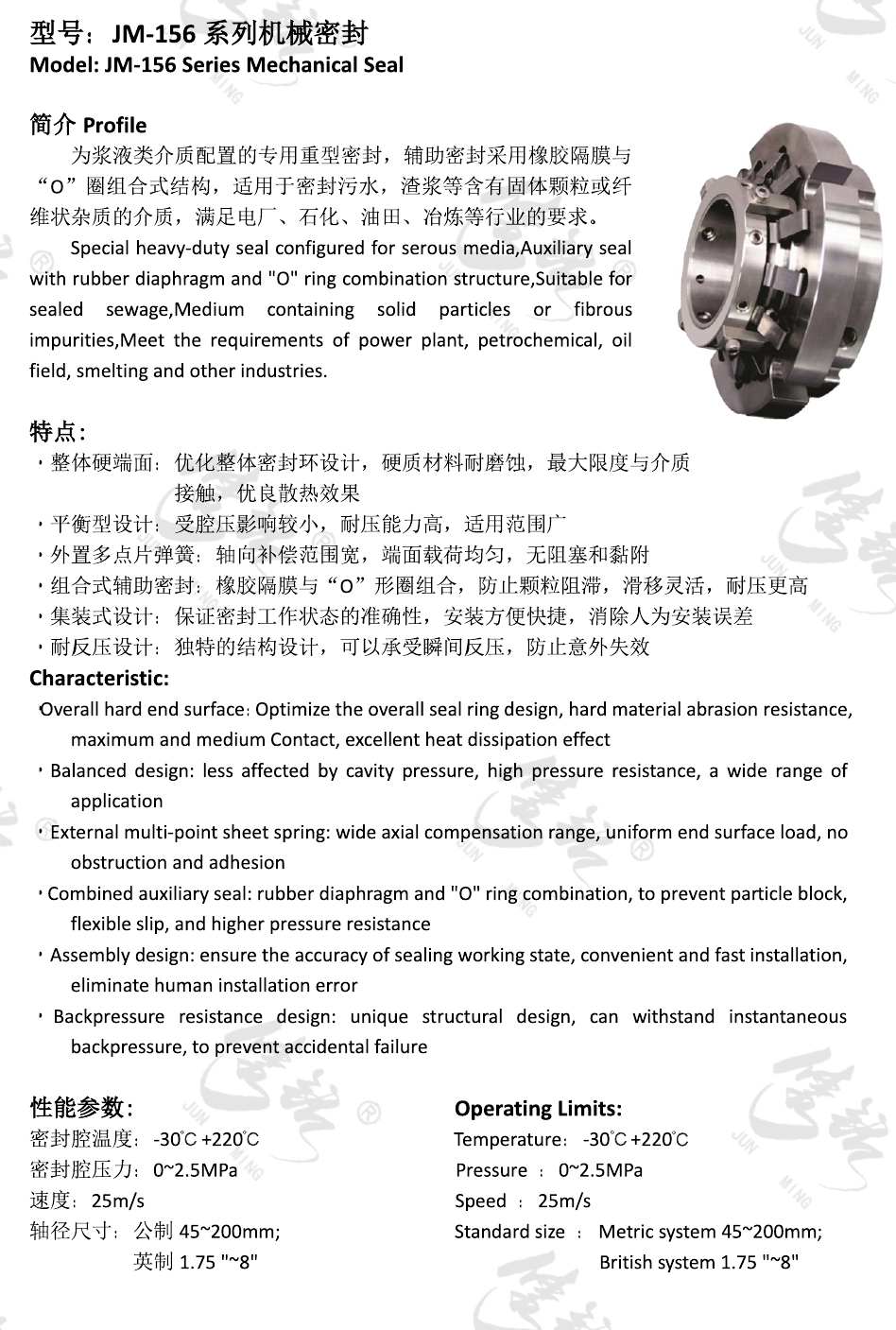 為漿液類介質(zhì)配置的專用重型密封,輔助密封采用橡膠隔膜與“O”圈組合式結(jié)構(gòu),適用于密封污水,渣漿等含有固體顆?;蚶w維狀雜質(zhì)的介質(zhì),滿足電廠、石化、油田、冶煉等行業(yè)的要求。