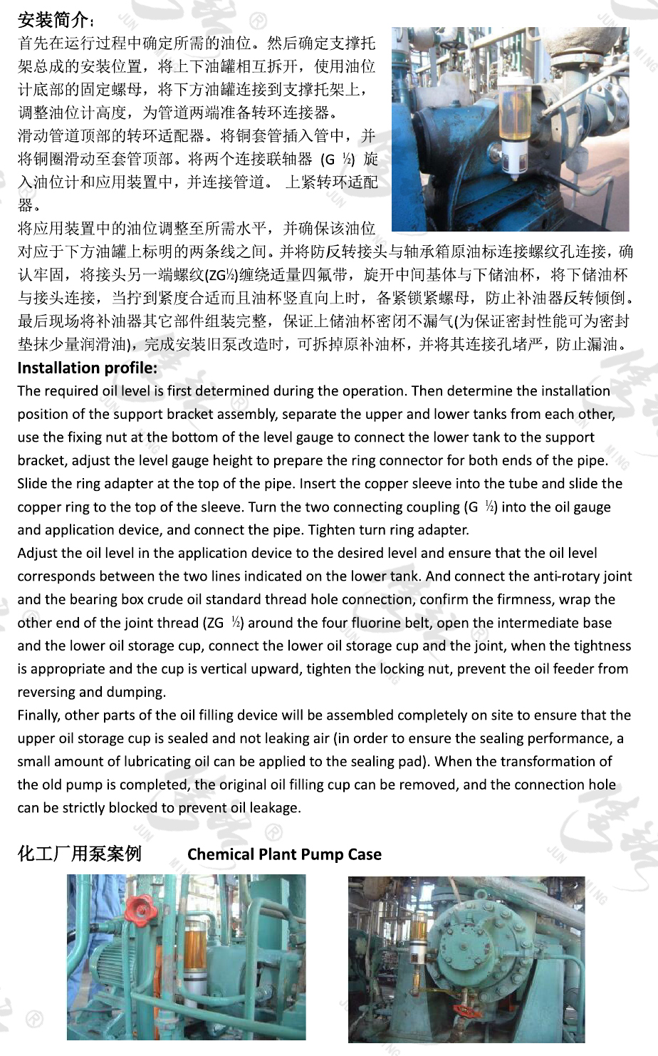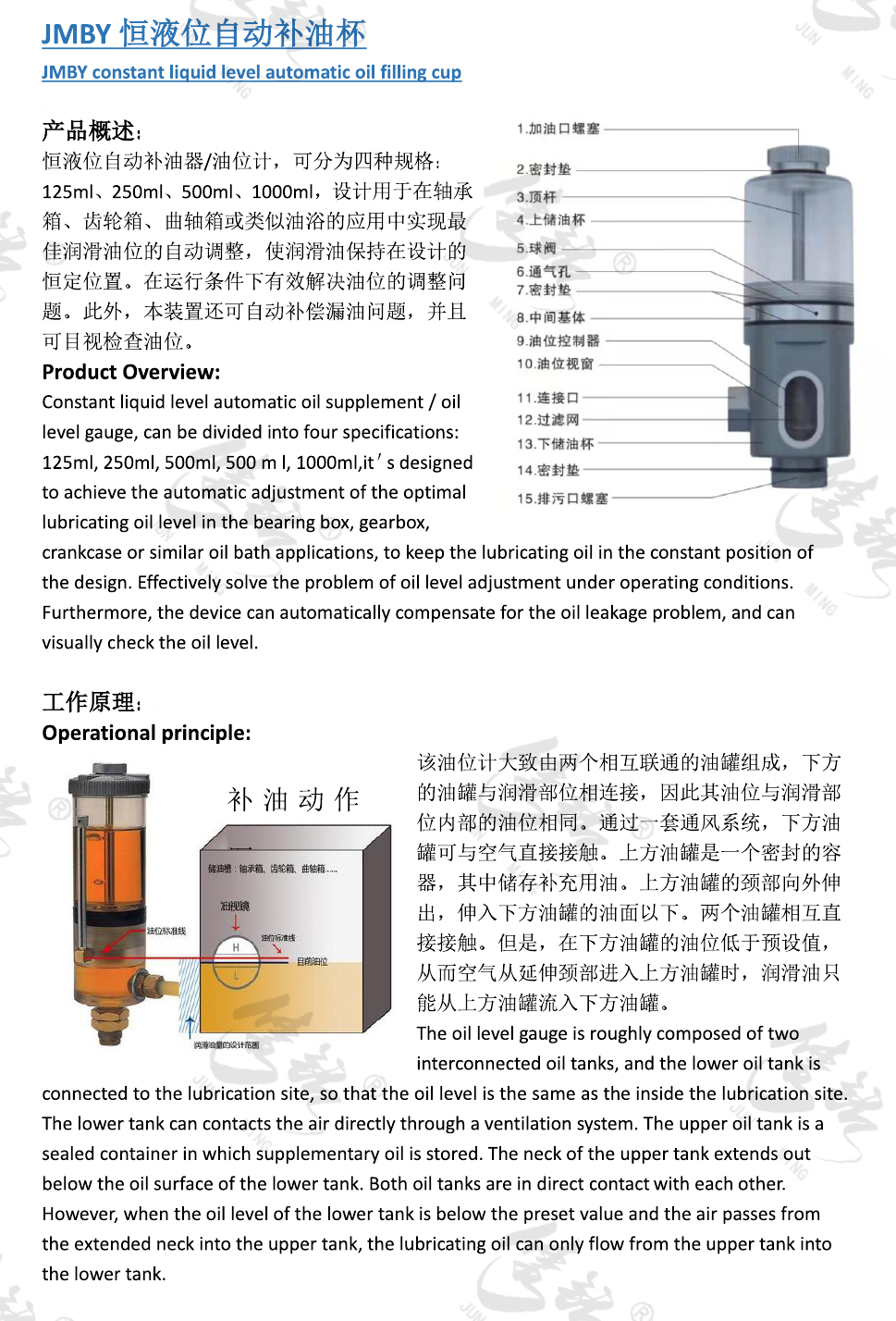 恒液位自動補油器/油位計,可分為四種規(guī)格:125ml、250ml、500ml、1000ml,設(shè)計用于在軸承箱、齒輪箱、曲軸箱或類似油浴的應(yīng)用中實現(xiàn)最佳潤滑油位的自動調(diào)整,使?jié)櫥捅3衷谠O(shè)計的恒定位置。在運行條件下有效解決油位的調(diào)整問題。此外,本裝置還可自動補償漏油問題,并且可目視檢查油位。